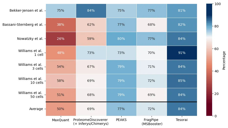 Surprisingly, our approach consistently identifies more peptides than FragPipe, PEAKS, and Proteome Discoverer (12%, 9%, and 21% more, respectively, across a range of datasets). Tesorai Search is also fast – 250 immunopeptidomics searches in 45 minutes.